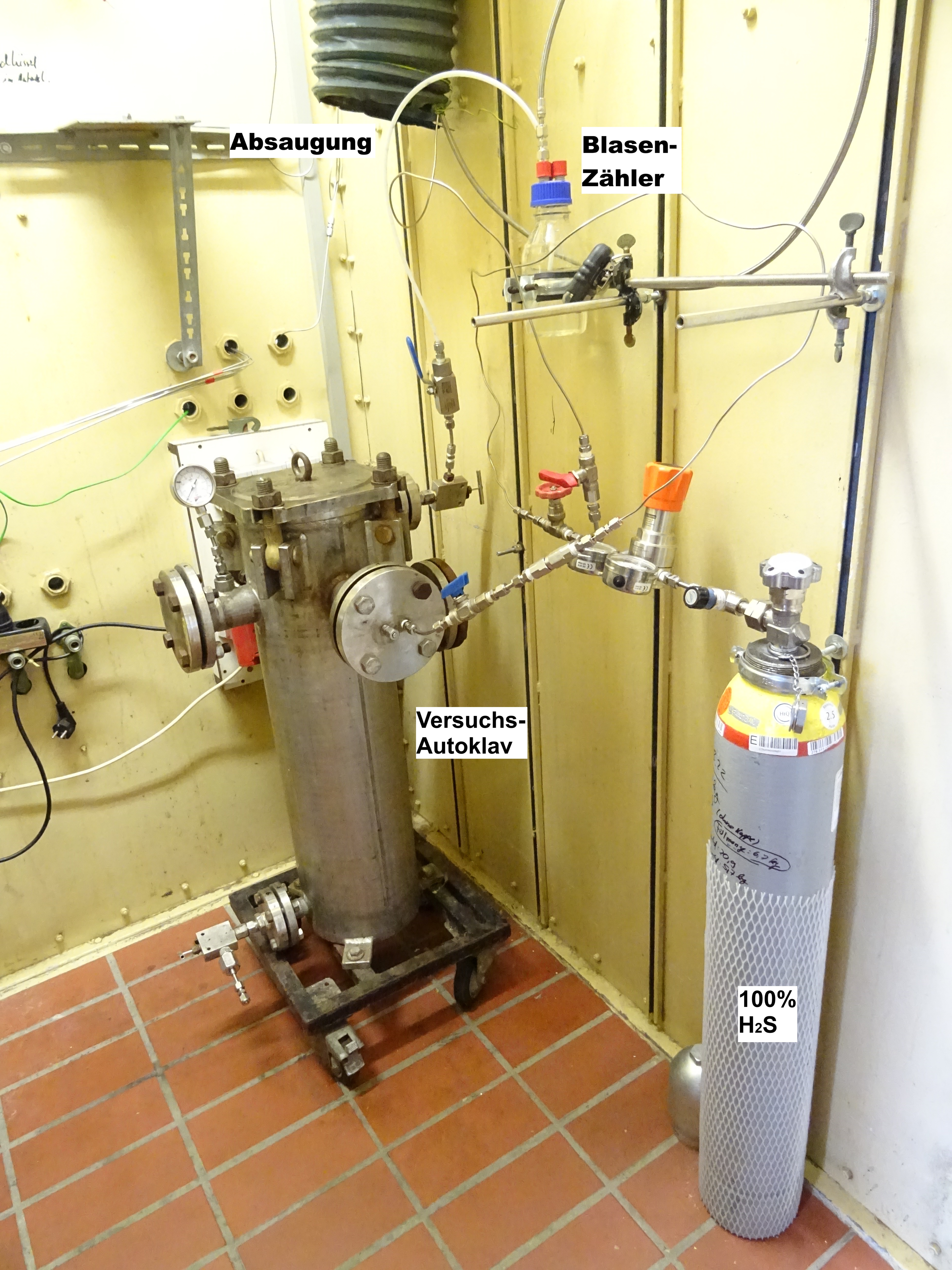 Das IFINKOR verfügt über die apparativen und sicherheitstechnischen Ausrüstungen und jahrzehntelange Erfahrungen (insbesondere bei der Förderung und beim Transport von Erdöl und Erdgas), um Untersuchungen mit H2S vom flüssigen Zustand (Studien zum Phasenverhalten) bis hin zu Umgebungen mit hohen H2S-Partialdrucken und erhöhten Temperaturen durchzuführen. Tests auf Werkstoffempfindlichkeiten für HIC (Hydrogen Induced Cracking), SSC (Sulfide Stress Cracking) oder SOHIC (Stress-Oriented Hydrogen-Induced Cracking) ohne und in Gegenwart von Elementarschwefel werden sowohl nach Normvorgaben (NACE TM0184, NACE TM0177, NACE MR0175/ISO 15156) als auch nach Kundenwünschen (Fitness-for-Purpose) durchgeführt. Hierfür steht im IFINKOR eine große Anzahl von teilweise speziell entwickelten Hochdruckapparaten unterschiedlicher Volumina bereit.