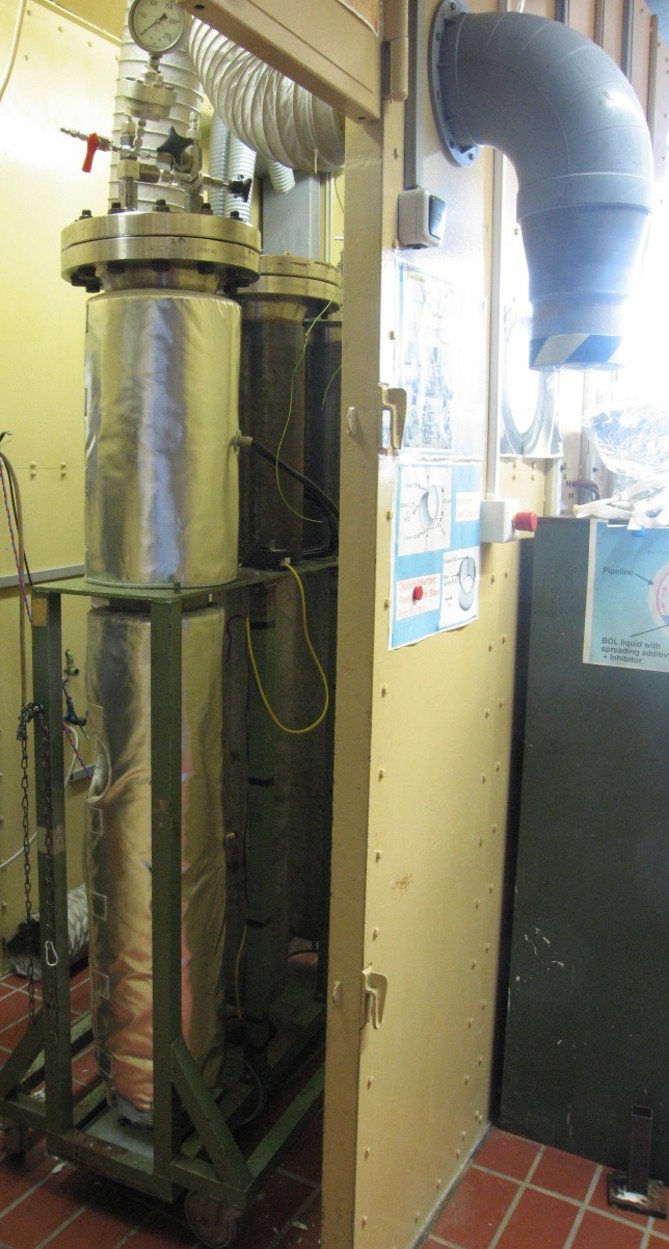 Für Ermittlung der Dauerbeständigkeit von Werkstoffen in Betriebsmedien (z. B. organische Beschichtungen oder Kunststoffe in organischen Lösemitteln) in Auslagerungszeiten bis zu 1 Jahr stehen 6 Rohrautoklaven (60 L Inhalt, bis 100 bar, bis 150 °C) zur Verfügung.